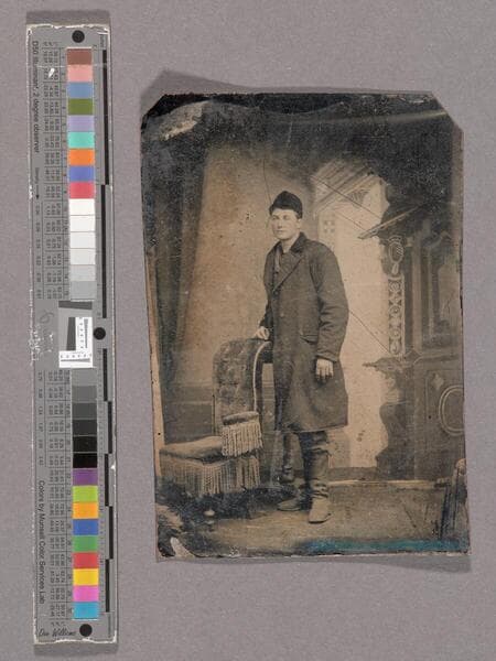 Portrait of two unidentified men posed at a gate with a studio backdrop