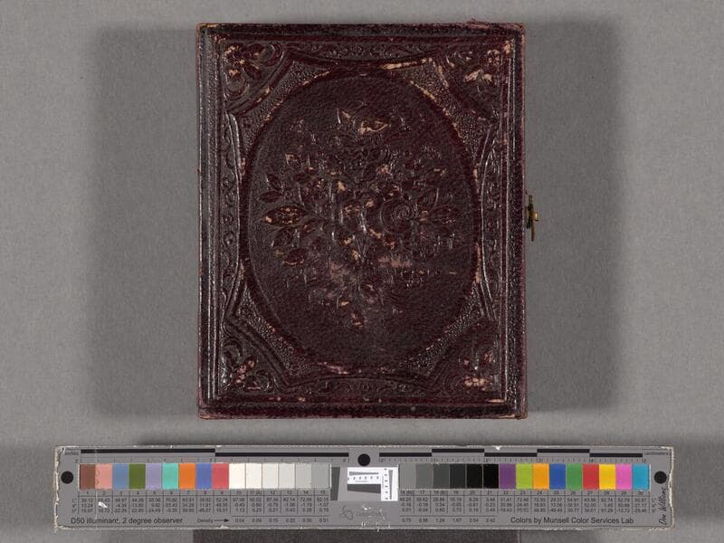 A note with the item reads: "Mary Emma Hoyt, a school teacher in Los Angeles, 1863," however the brass mat has the stamp of photographers Silas A. and William B. Holmes, 289 Broadway, New York ("Holmes, 289 Broadway"), who operated from 1849-1852. Possibly this is not the original mat for this photograph, or the identification may be incorrect.