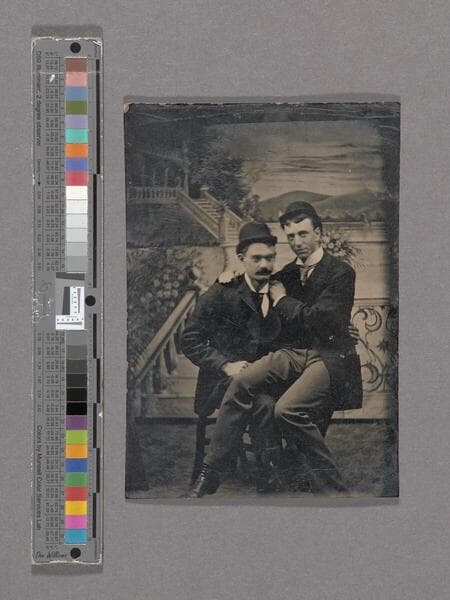 Portrait of two unidentified men posed at a gate with a studio backdrop