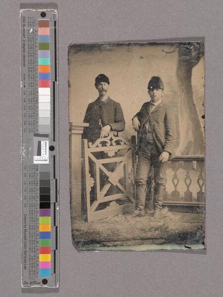 Portrait of two unidentified men posed at a gate with a studio backdrop
