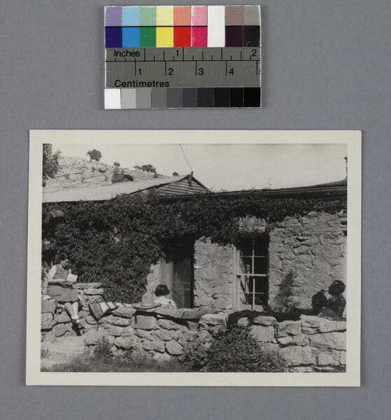 Grace Burke Hubble and Edwin Powell Hubble sitting in a patio outside a stone house in Shonto, Arizona, 1937