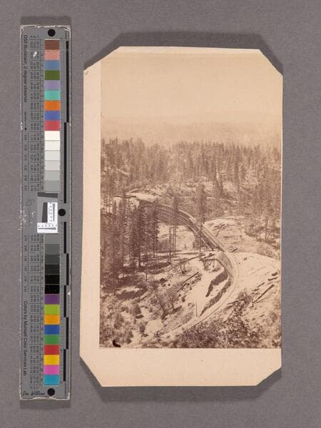 This collection contains 372 stereographic photographs (including some variants and duplicates) by photographer A. A. Hart that document the construction of the western half of first transcontinental railroad by the Central Pacific Railroad between 1864 and 1869. The collection includes all but seven of the original series, numbered from 1 to 364 by Hart (lacking 193, 323, 333, 358, 359, 362, and 364). The images chronicle the advancement of the railroad over 742 miles in California and the Sierra Nevada Mountains, Nevada, and Utah. The majority of the photographs are views of mountains, lakes, rivers, and forested areas (some with stumps from clear-cutting in the foreground), often with railroad tracks running through the center of the images. In addition, there are also images of locomotives, Chinese and other workers, equipment, bridges, tunnels, frontier and mining towns, construction camps, as well as some images of Native Americans, including Paiute and Shoshone Indians. The stereographs primarily contain Hart's own Sacramento imprint with series titles including: "Scenes in the Sierra Nevada Mountains"; "Scenes in the Valley of the Sacramento"; "Scenes in the Washoe Range"; "Scenes on the Humboldt River"; and "Scenes near Great Salt Lake". Interspersed in the collection are stereographs published without credit to Hart by Frank Durgan and Carleton E. Watkins.
