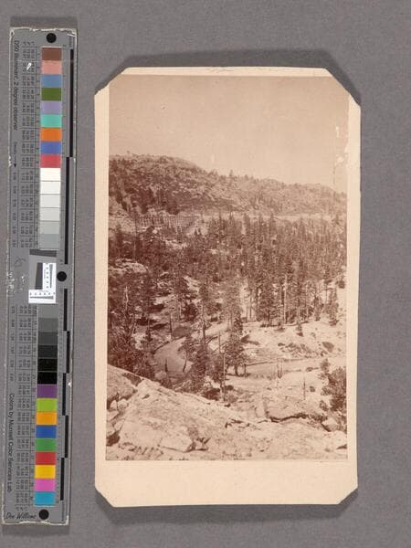 This collection contains 372 stereographic photographs (including some variants and duplicates) by photographer A. A. Hart that document the construction of the western half of first transcontinental railroad by the Central Pacific Railroad between 1864 and 1869. The collection includes all but seven of the original series, numbered from 1 to 364 by Hart (lacking 193, 323, 333, 358, 359, 362, and 364). The images chronicle the advancement of the railroad over 742 miles in California and the Sierra Nevada Mountains, Nevada, and Utah. The majority of the photographs are views of mountains, lakes, rivers, and forested areas (some with stumps from clear-cutting in the foreground), often with railroad tracks running through the center of the images. In addition, there are also images of locomotives, Chinese and other workers, equipment, bridges, tunnels, frontier and mining towns, construction camps, as well as some images of Native Americans, including Paiute and Shoshone Indians. The stereographs primarily contain Hart's own Sacramento imprint with series titles including: "Scenes in the Sierra Nevada Mountains"; "Scenes in the Valley of the Sacramento"; "Scenes in the Washoe Range"; "Scenes on the Humboldt River"; and "Scenes near Great Salt Lake". Interspersed in the collection are stereographs published without credit to Hart by Frank Durgan and Carleton E. Watkins.