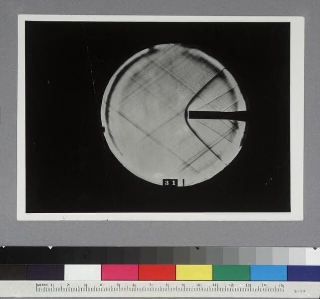 Shadow photograph of air shock waves off a 37 mm shell, at the U.S. Army Ballistic Laboratory
