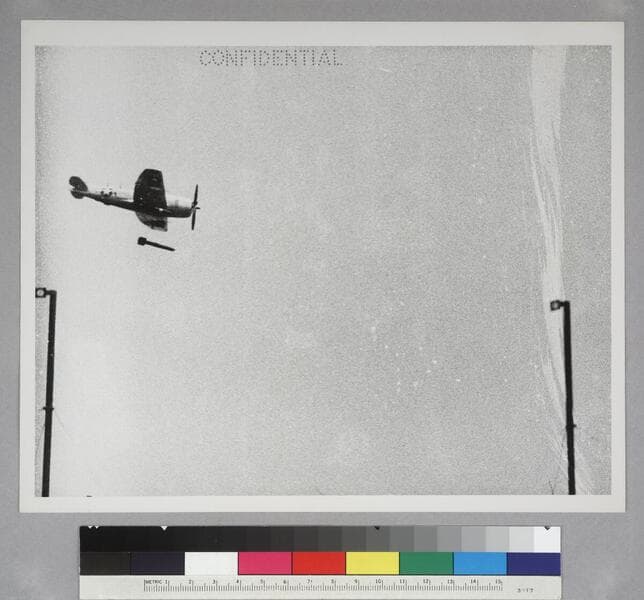 Montage of multiple photographs, showing missile being released from a plane. Note in the hand of Grace (Burke) Hubble: "EPH Huntington Library"