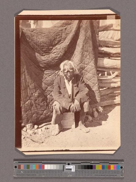 View of an elderly Native American man at the San Antonio de Padua mission in Monterey County, California.