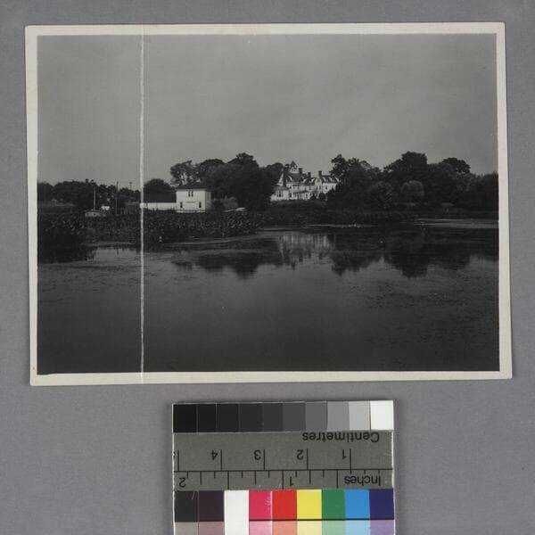 The house ("Haunted House") in which Edwin Powell Hubble and Grace Burke Hubble lived while he worked at the U.S. Army Ballistic Laboratory, 1942-1945. Note in the hand of Edwin Powell Hubble: "Haunted House, Spesutie Island, Aberdeen, Md., 1945. Grace and Edwin lived here, 1942-1945". The front and side of the house are visible, as is a brick chimney and a tree.