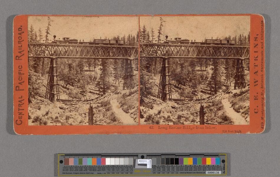 This collection contains 372 stereographic photographs (including some variants and duplicates) by photographer A. A. Hart that document the construction of the western half of first transcontinental railroad by the Central Pacific Railroad between 1864 and 1869. The collection includes all but seven of the original series, numbered from 1 to 364 by Hart (lacking 193, 323, 333, 358, 359, 362, and 364). The images chronicle the advancement of the railroad over 742 miles in California and the Sierra Nevada Mountains, Nevada, and Utah. The majority of the photographs are views of mountains, lakes, rivers, and forested areas (some with stumps from clear-cutting in the foreground), often with railroad tracks running through the center of the images. In addition, there are also images of locomotives, Chinese and other workers, equipment, bridges, tunnels, frontier and mining towns, construction camps, as well as some images of Native Americans, including Paiute and Shoshone Indians. The stereographs primarily contain Hart's own Sacramento imprint with series titles including: "Scenes in the Sierra Nevada Mountains"; "Scenes in the Valley of the Sacramento"; "Scenes in the Washoe Range"; "Scenes on the Humboldt River"; and "Scenes near Great Salt Lake". Interspersed in the collection are stereographs published without credit to Hart by Frank Durgan and Carleton E. Watkins.