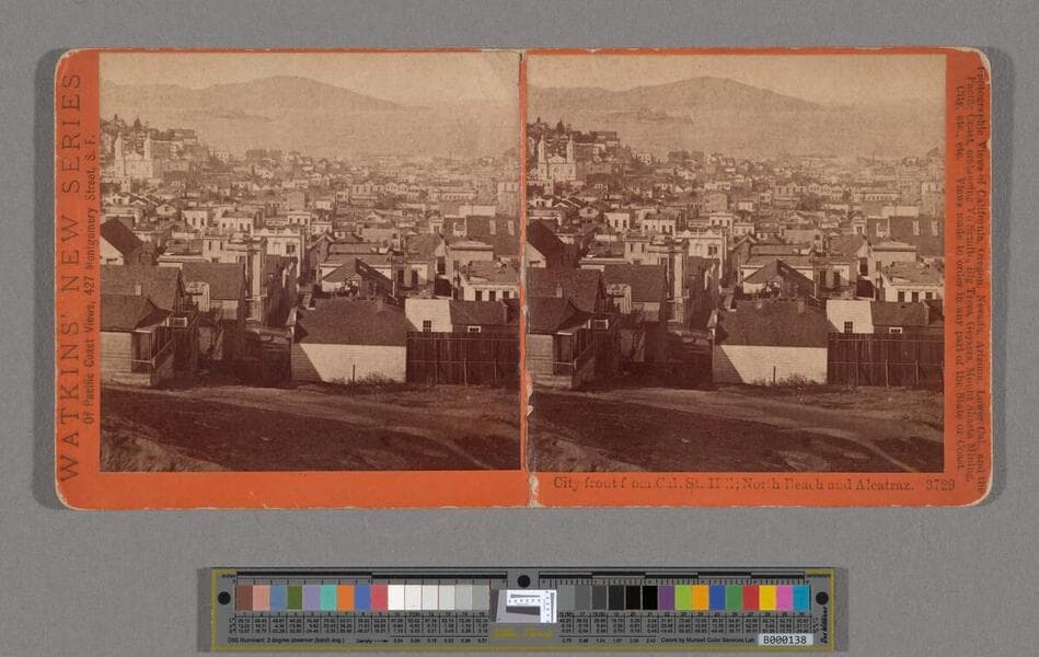 This collection contains 269 stereographs by photographer Carleton E. Watkins, dating from the 1860s to about the 1880s, that chiefly depict buildings, points of interest, and locales in Northern and Southern California. The collection includes 1 stereograph from the Central Pacific Railroad series; 5 stereographs from Watkins' Pacific Railroad Series; 110 stereographs from Watkins' Pacific Coast series; and 150 stereographs from Watkins' New Series. The Watkins' Pacific Coast Series, created between 1861 and 1874, primarily depict locales in Northern California with many images of buildings in San Francisco, views of Yosemite and Mariposa County, Missions, and some mining operations including photographs of the North Bloomfield Gravel Mining Company in Nevada County, California. The Watkins' New Series stereographs, created between 1874 and 1890, consist of images of both Southern California and Northern California, in cities including San Francisco, Pasadena, San Marino, Sierra Madre, and San Gabriel. Among the Southern California residences and properties depicted include the Sunny Slope Ranch of L.J. Rose in San Gabriel, Willow Dale owned by N.C. Carter, and Lake Vineyard owned by B.D. Wilson. Some of the stereographs in Watkins' Pacific Coast Series include titles in the margins in Watkins' own hand (see Nos. 1033, 1135, 1146, 1153, and 1721).