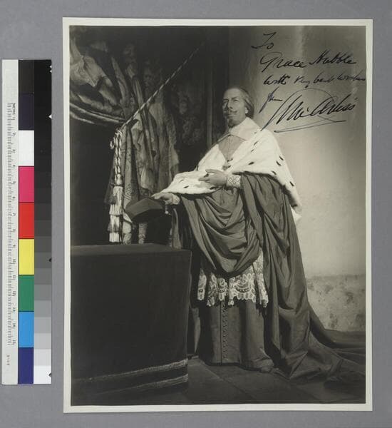 Studio portrait of George Arliss inscribed to Grace Burke Hubble.