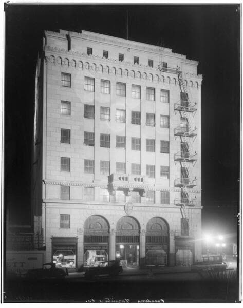 Rainy day view of the Standard Oil Station at 520 East Colorado and the multi-story Pasadena Furniture Company next door.