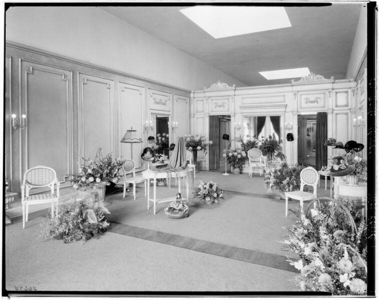 Interior of Fishers Apparel Shop at 416 East Colorado, with displays of women's clothing. Room furnished with wood furniture and display cases and floral arrangements.