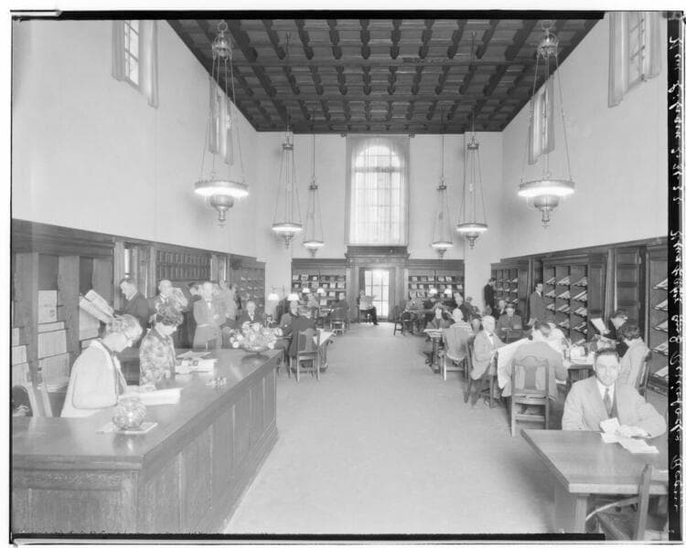View of the circulating room of the Pasadena Public Library, a high-ceilinged room with wood bookshelves and paneling, tapestries, multiple tables and chairs, and circulation and information desks on the left and in the center. Many of the chairs are occupied, and people stand in line waiting to be helped by the library staff. The library's address is 285 East Walnut.