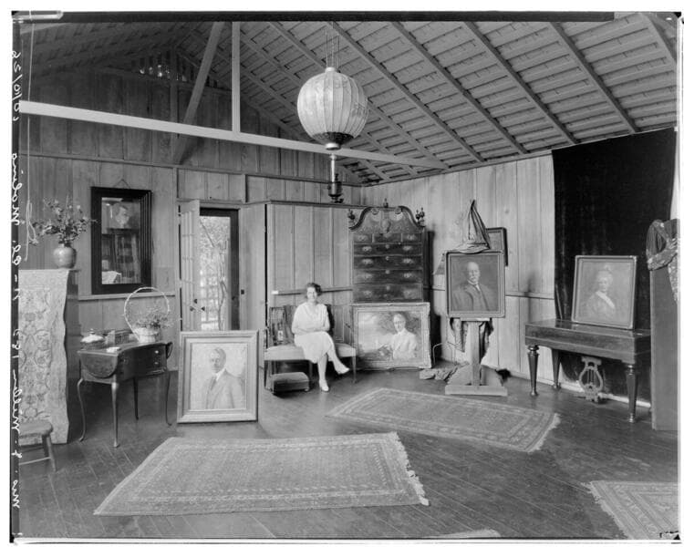 Pasadena. 182 North El Molino. Artist studio room, paintings on easels, woman seated