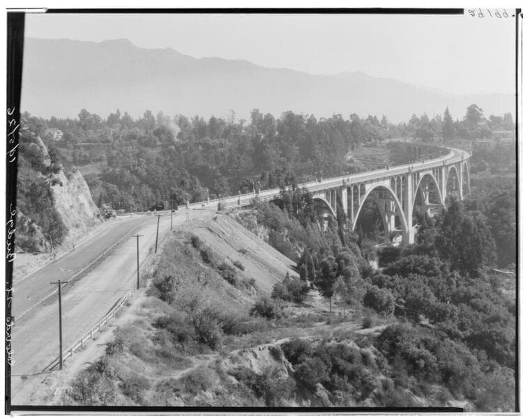 Elevated view of the Colorado Street Bridge from the west bank. Some automobiles are in motion across the bridge and the San Gabriel Mountains are in the background.