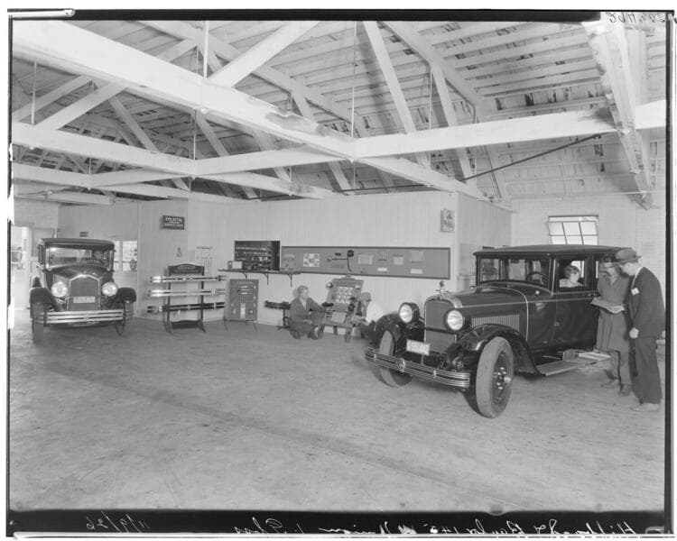 Pasadena. Hibbard and Baylor. 145 West Union. Interior automobile repair shop with automobiles, servicemen and customers