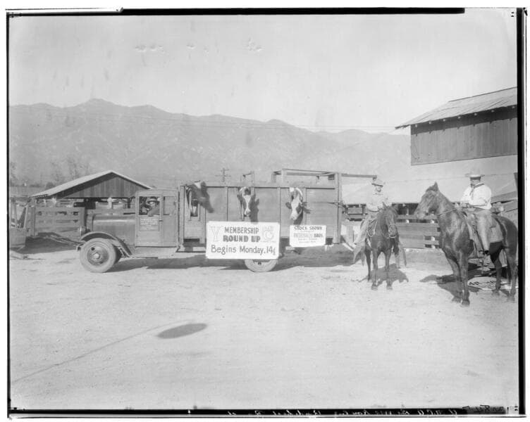 Pasadena. Biedebach Brothers Ranch. 3425 East Colorado. Horses, truck, dairy barn, "Roundup" for YMCA Membership drive