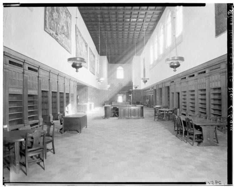 View of the circulating room of the Pasadena Public Library, a high-ceilinged room with wood bookshelves and paneling, tapestries, multiple tables and chairs, and circulation and information desks on the left and in the center. Many of the chairs are occupied, and people stand in line waiting to be helped by the library staff. The library's address is 285 East Walnut.