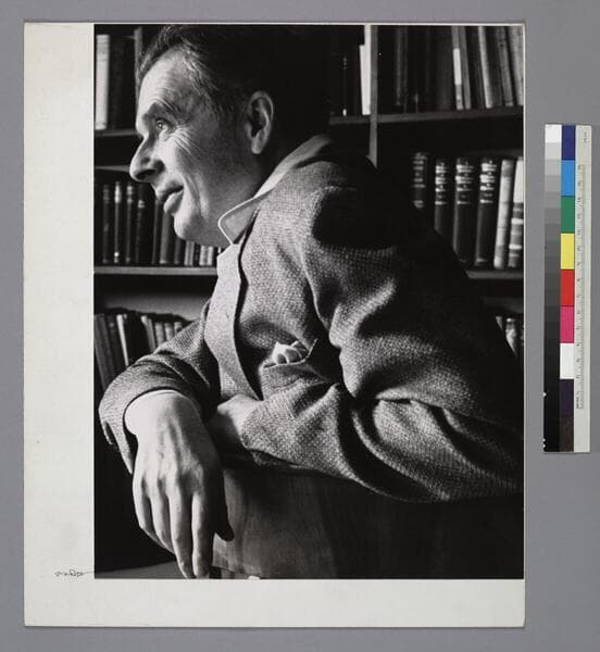 Studio portrait of Aldous Leonard Huxley. Note in the hand of Grace Burke Hubble in upper margin: "Hubble Collection-Aldous Huxley-probably early 1940's."