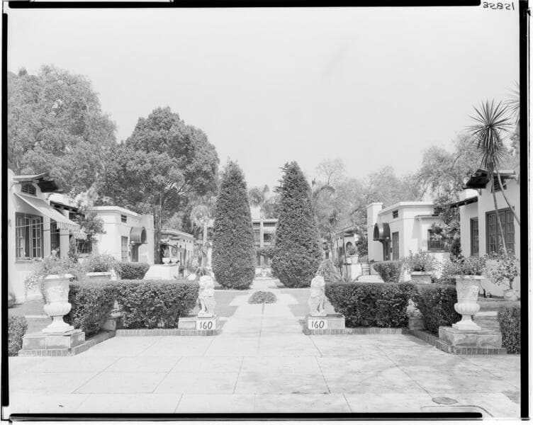Pasadena. Alexandria Court. 160 South Los Robles. Exterior, front view of bungalow court