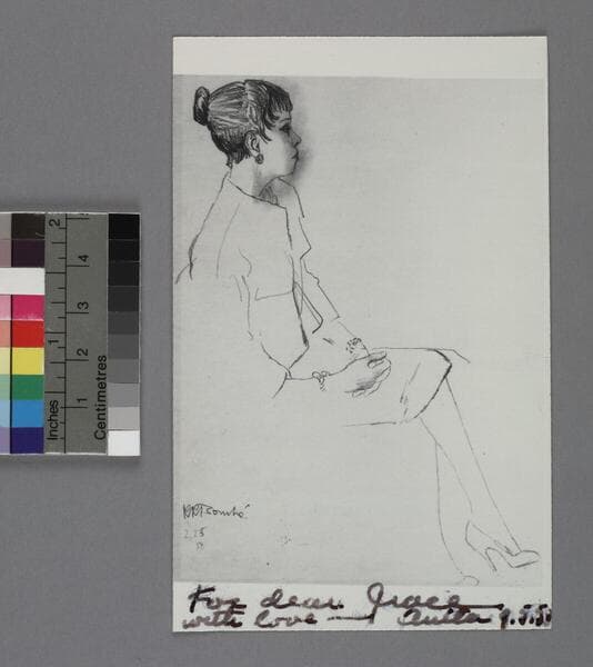 Painting of Anita Loos by Doug Davis. Inscribed to Grace Burke Hubble from Anita Loos with a note. Note in the hand of Grace Burke Hubble on verso: "Painted by American, Doug Davis, exhibited at Sagittarius Galleries, New York. Feb 1957-1958 (Anita Loos)." Anita Loos was an author.