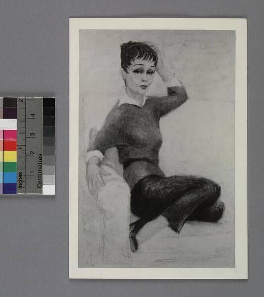 Sketch of Anita Loos by Rene Bouche. Inscribed to Grace (Burke) Hubble from Anita Loos. Note in the hand of Grace Burke Hubble on verso: "Rene Bouche's sketch of his painting. 1958 (Anita Loos)".