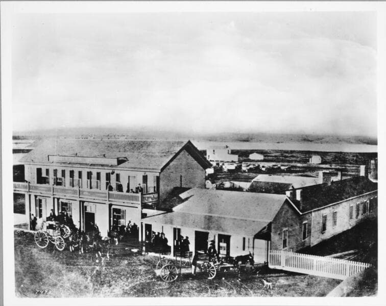 Image of the Santa Monica Hotel on Ocean Avenue in Santa Monica, California, with horse-drawn wagons and buggies in front and people standing on the porch and balcony. The larger back building housed the sleeping quarters, the front building had offices and the dining room.
