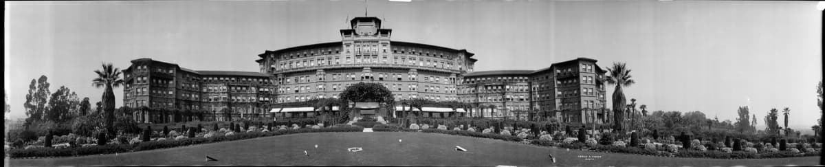 A panoramic view of the front of the Huntington Hotel, at the corner of Oak Knoll and Wentworth. The drive that leads to the front entrance is lined with bushes and shrubs and the wings of the hotel are starting to be covered with crawling vines. There is an arch constructed over the entrance which in later years is fully overgrown by plants (see images 40001 and 40002).