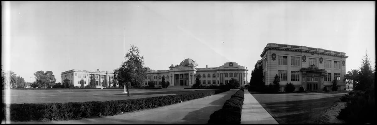 A panoramic view of Pasadena High School on East Colorado, at the southwest corner with Sierra Bonita. The buildings are arranged in a u-shape around a broad lawn with a flag pole that has no flag on it.