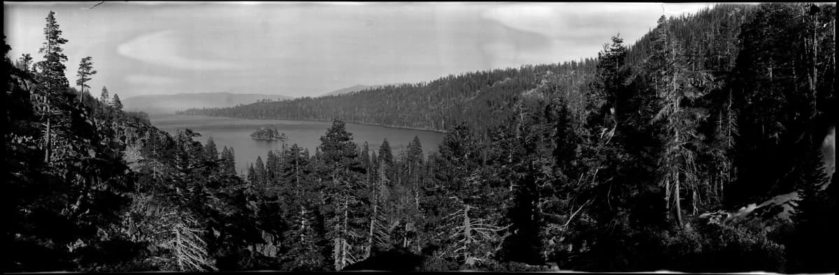 A panoramic view of Emerald Lake at Lake Tahoe. A steamboat with a crowd of passengers is docked at the pier. Women and children are seated on the hill overlooking the water. One of the women has a small child in a pram. There is a timber and stone building uphill on the left.