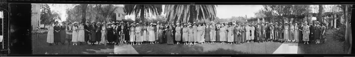 A panoramic group portrait of the Lamanda Park Women's Club. There are around 50 women wearing white dresses with dark kerchiefs at the neck, and they are surrounded by men, women, and children. There is a musical group on the right.