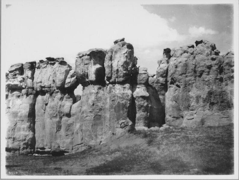 A view of an opening in the walls leading into Acoma with with two fences forming a corral. In front of the corral there is an Indian riding a burro who is dwarfed by huge boulders in the foreground.