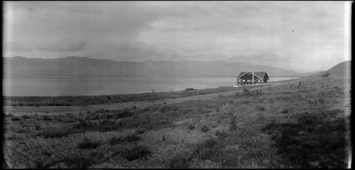 A panoramic view of Lake Elsinore with buildings and trees. There is a house on the far bank of the lake on the left, then, going right, a large multistory building, trees, an orchard, and several houses built away from the water.