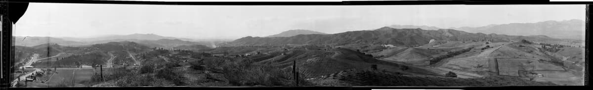 A panoramic view of a street of houses at an unidentified location in Long Beach. Although most of the houses are completed, there are a few still under construction on the far right. There are several automobiles parked on the far right, and one closer to the center, next to a horse. The land in the foreground is undeveloped. Writing in white in bottom left corner reads "Aerograph Co. ; No 350 ; 1763 W Vernon Ave".