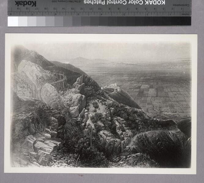 View from Mount Lowe in the San Gabriel Mountains on the buildings of the Echo Mountain House hotel, at left, and the Mt. Lowe Observatory, at right, on Echo Mountain, with the city of Pasadena, California, and the San Gabriel Valley below.