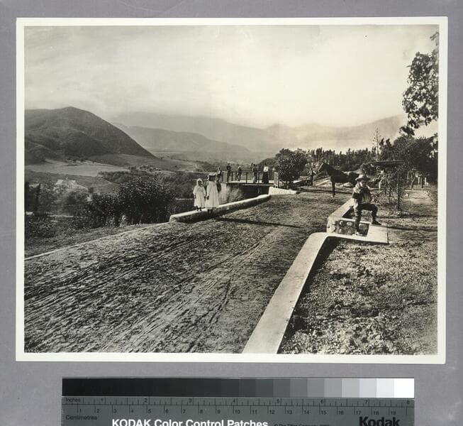Two albums containing ninety-seven photographs, chiefly by amateur photographer S. L. Walkley, of buildings and landscapes in Los Angeles County and San Diego County, California, in 1888. These professional-quality views by Walkley depict newly constructed buildings, street scenes, and the natural landscape, including the flora. These volumes may have been Walkley's own albums as they contain photographs of the construction and finished exterior of his residence on St. John Street in Pasadena, California. The albums include photographs of houses, hotels, streets, and buildings in Pasadena, California and the surrounding towns of Alhambra, San Gabriel, Whittier, and others as well as views of the Arroyo Seco, Little Santa Anita Canyon, Eaton Canyon, and the path to Mount Wilson in the San Gabriel Mountain area. There are photographs of downtown Los Angeles; Hotel del Coronado and Old Town San Diego in San Diego County; and Avalon and Avalon Harbor on Santa Catalina Island. Several photographs show African American trainers with camels and elephants as well as an open circus wagon containing lions (volume 1, items 37-40) These scenes may be associated with the Sells Brothers Circus, which visited Los Angeles in October 1888 (See also volume 2, item 31). There is one photograph of a train labeled "Tia Juana & N.C. & O. Rwy. Train" (volume 1, item 30), presumably referring to the National City & Otay Railroad, a subsidiary of the Santa Fe Railroad, formed in 1886, which connected downtown San Diego with the Sweetwater Dam (San Diego County), La Presa (San Diego County), and Tijuana (Mexico). Two photographs bear the imprint of C.W. Herr and depict street scenes in Provo, Utah and Ogden, Utah (volume 1, items 35 and 36).