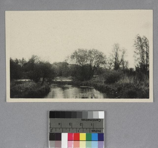 The Test River, England. Note in the hand of Edwin Powell Hubble on verso: "Edwin's Fishing, 1936." Note in unidentified hand: "River Test near Longstock Beats 6 and 7." On the left, a building with a thatched roof is visible, and near the center a wooden bridge, or pier, is visible, extending from the shoreline into and across the river.