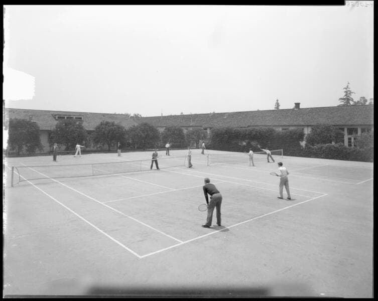 Boys playing tennis, Polytechnic Elementary School, 1030 East California, Pasadena. 1936