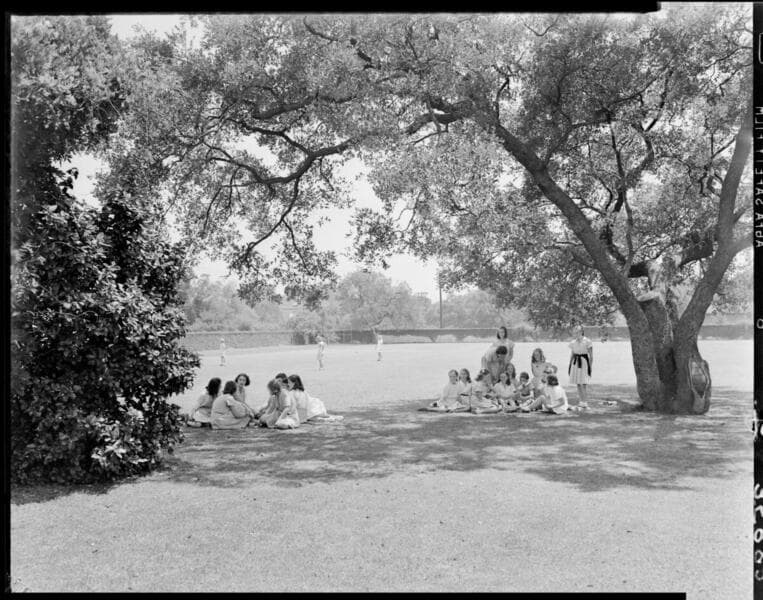 Girls under tree, Polytechnic Elementary School, 1030 East California, Pasadena. May 15, 1940