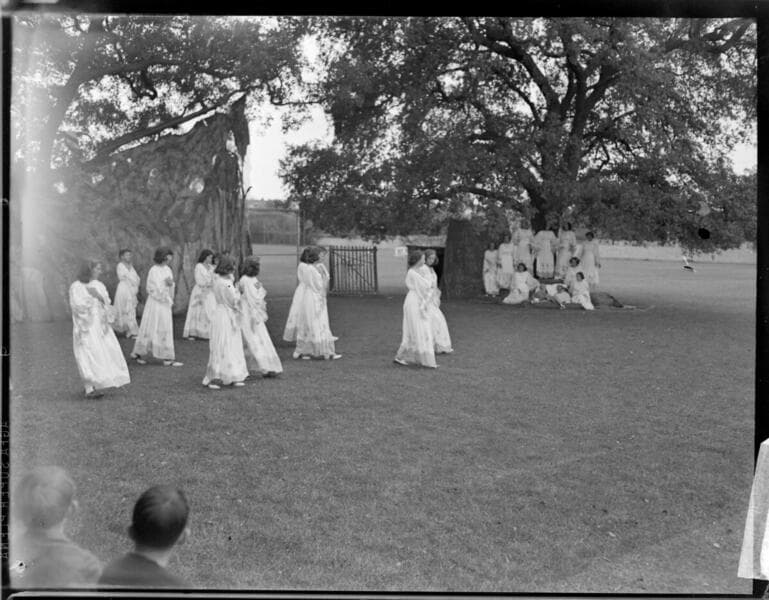 Girls participate in a festival rehearsal in the school yard of Polytechnic Elementary School at 1030 East California. Twelve girls in long white dresses are standing or kneeling around two "sleeping" children. A cloth backdrop hangs from the tree.