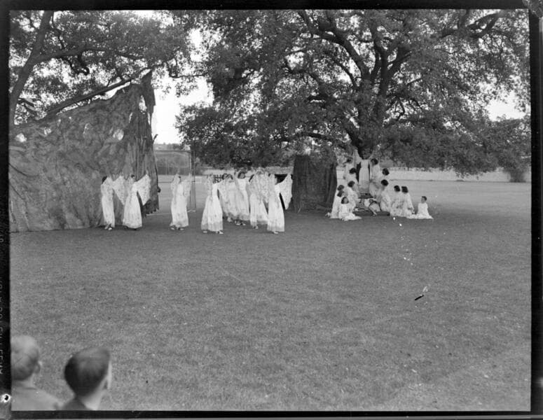 Girls participate in a festival rehearsal in the school yard of Polytechnic Elementary School at 1030 East California. Twelve girls in long white dresses are standing or kneeling around two "sleeping" children. A cloth backdrop hangs from the tree.