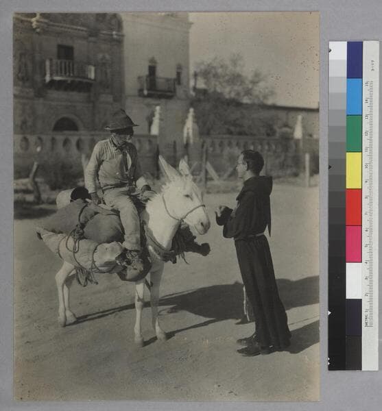 1 photograph of a prospector and a priest outside San Xavier del Bach Mission near Tucson, Ariz