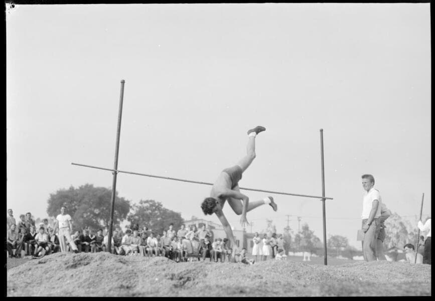A boys' high jump event at a track meet at Polytechnic Elementary School at 1030 East California. A crowd of school children and adults watch from benches in the background.