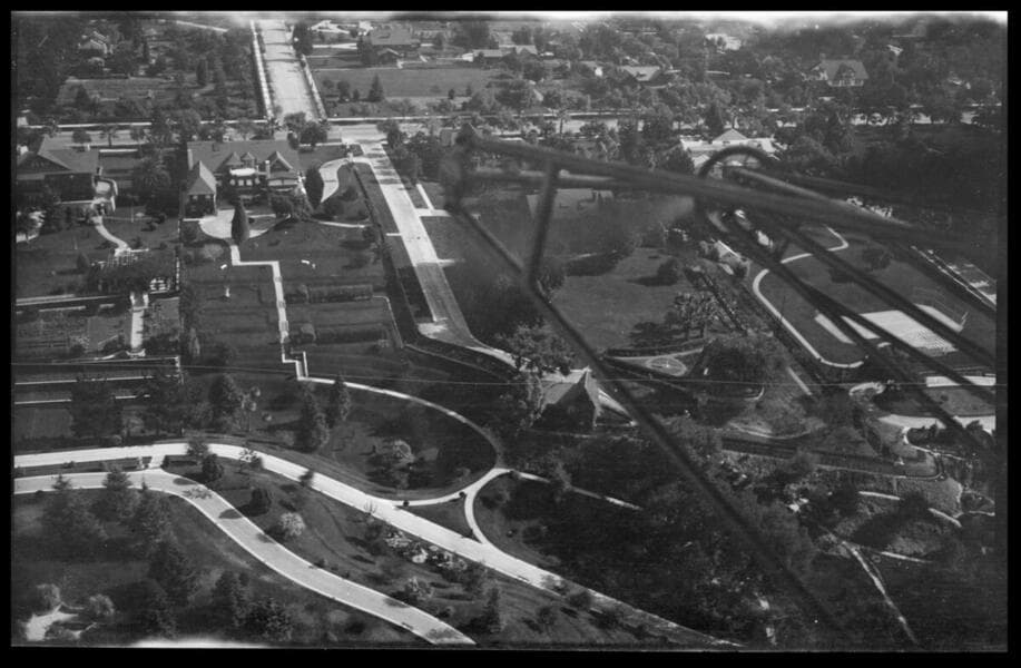 An aerial view of a residential area taken during Roy Knabenshue’s dirigible flight over Pasadena. The houses shown are large, with extensive gardens and lawns.