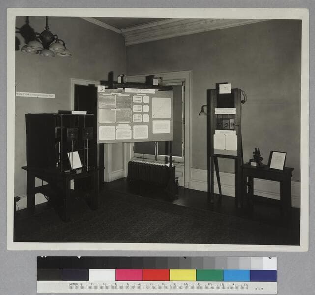Astronomy exhibit at the Carnegie Institute. Note in the hand of Grace Burke Hubble on verso: "Exhibit--Carnegie Inst. at Washington. 1940--see Journals." Two large display boards are set up, showing multiple photographs of various nebulae and galaxies.