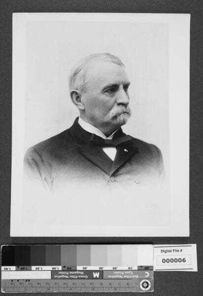 Black and white portrait photograph of Harrison Gray Otis. Profile and bust length view, wearing dark suit and necktie, with light colored vest and oval brooch on tie knot. Larger view of Image Number 000001.