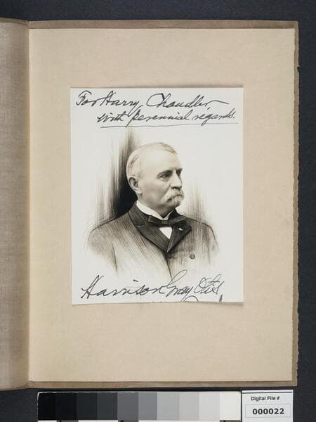 Black and white portrait photograph of Harrison Gray Otis. Profile and bust length view, wearing dark suit and necktie, with light colored vest and oval brooch on tie knot. Larger view of Image Number 000001.