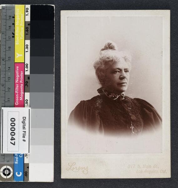 Black and white portrait photograph of Eliza A. Otis, wife of Harrison Gray Otis. Facing forward and bust length, wearing dark dress with lace trimmed collar. Text on back of photo reads, "Mrs. Eliza A. Otis, Bd. [sic] of Directors 10-14-1884 to 11-12-1904." Related to Image Number 000047 - sepia toned print.