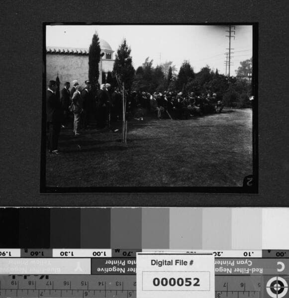 Black and white photograph of view of the three-story building housing memorial chimes for Eliza A. Otis, wife of Harrison Gray Otis at Hollywood Cemetery. Chimes visible through five arched openings in front of building, with one window on second floor, two windows on first floor, to left and right of entrance. Six ornamental roof spikes visible. Power line in background; group of people standing in front of entrance to building in foreground. Related to Image Number 000051, 000054, 000055.