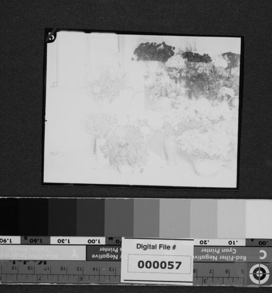 Black and white photograph, partial view, to the left and center of photo, of assortment of flowers in baskets, vases, planters for the memorial service of Eliza A. Otis, wife of Harrison Gray Otis. Connecting view is Image Number 000057. Image is overexposed. "6" stamped on top left corner of photo.